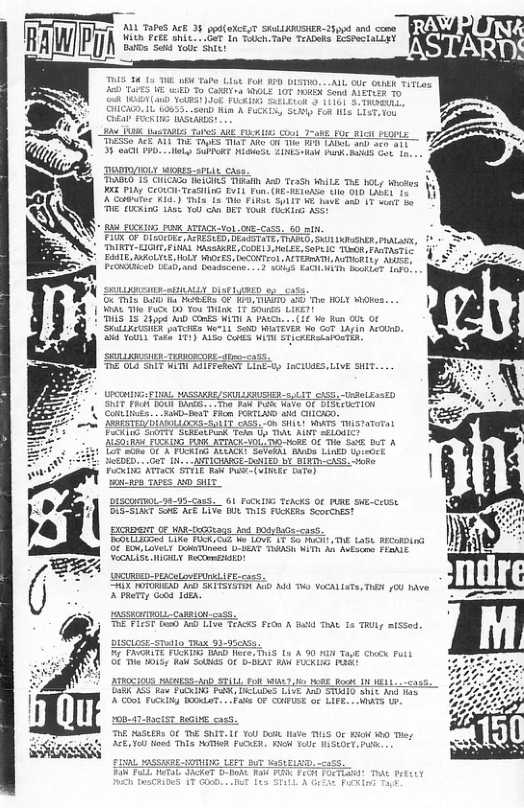 ![B et o v e SELLING "PUNK"? OR SURVIVING ON VERY LITILE. 1 HOPR TO COVER THE ARGUMENT THAT THERE ARE PUNKS WITH REGULAR REPUTATIONS IN THE PUNK HARDCORE SCENE, THAT ARE SELLING THE VERY ROOTS OF THE WHOLE MOVEMENI EVERYDAY. AND MOST PEOPLE WILL AGREE ALSO THAT THERE ARE BILLS 10 PA) AND PROBLEMS WITH PRINTING STUFF AND THE COST LEVEL AND DONT FORGET ABOUT THE EVER INCREASING POSTAGE FACTOR.RIGHIZ THOSE ARE NOT THE PROBLEMS I AM SPEAKING OF THIS TIME. WHILE THEY ARE NOTEWORTHY PROBLEMS EVERYONE WHO PUTS ANYIH] OUT FOR THE PUBLIC WILL RUN INTO THATS NOT THE PROBLEM. THE PROBLEM IS.. IF THIS MOVEMENT 1S ABOUT THE MESSAGE BEHIND YOUR MUSIC OR EVEN IF IT IS THE BASIS OF YOUR MUSIC WOULDN’T’ IT BE WISE T0 USE THE BEST RESOURCES OUT THEE WHEN MAKING YOUR PRODUCT SO WITH THAT IN MIND WHY VYNAL? IT SEEMS TO BE A WHOLE LOT MORE TROUBLE AND MONEY TO RENEAS YOUR BAND ON A SEVEN INCH THAT CAN ONLY HOLD T MINUTES COMPARED TO A NINETYMINUTE TAPE OR A SE OUR MINUTE CD? IS MAKING A SEVEN INCH ALMOST JUST LIKE A "SINGLE"? LIKE THE MAINSTREAM COMPANYS WE ALL (?) HATE? THERE ARE A LOT OF GOOD BANDS ALREADY PUTTING THERE MUSIC ON TAPES MAKING THEM CHEEP AND AFORDABLE MORE SO THEN A TEN MINUTE RECORD THAT COSTS THE SAME TO MAKE.. MPBYE THIS CAN’T BE FINISHED WITH THIS TOPIC IN ONE EASY SENTANCE OR PARAGRAGH. BUT IT SEEMS TO ME THAT IT WOULD BE A LOT LESS COLLECTABLE FOR SCENESTERS TO BE INIO TAPES. A LOT LESS MONEY TO BE WORTH AFTER YOUR OUT OF PUNK AND ARE TRYING TO SELL THEM ON ’THE COMPUTER..TAPES MAKE PUNK AFORDABLE AND CHEEP FOR ALL THOSE INVOLVED.. SO WHY STILL ‘THE OVERWHELMING AMOUNT OF RECORDS? SURE ~RECORDS WERE COOL AND NEAT-O BACK IN THE DAY BUL THE TIMES ARE CHANGING WHERE THE POOR KIDS ARE GEITING LOCK OUT OF PUNK BECAUSE THEY CANT AFFORD YOUR SPECIAL COLORED PRESSENG ON LIMITED GREENCOVERS.. AND WHO ARE YOU REACHING WITH LIMITED PRESSING/COLORED BLAH RECORDS.? IS IT MABYR ‘THAT THE BAND SUCKS AND NEEDS MORE PACKAGING THEN EVERY OTHER RECORD? IS THE PUNK BAND JUSI ANOTHER PRODUCT? E THEN ‘THE BAND ITSELF? I DONT UNDERSTAND THIS WHY SHOULD A BAND ONLY HAVE A RECORD AND THEY HAVE NEVER HADA DOES ‘THAT MAKE ANY SENCE I’D LIKE 10 SOME FEEDBACK FROM THIS I WLLL PRINI ALL SMART ANSWERS OR IDEAS .....](Rawpunkbastards Summer 2000 17.png)